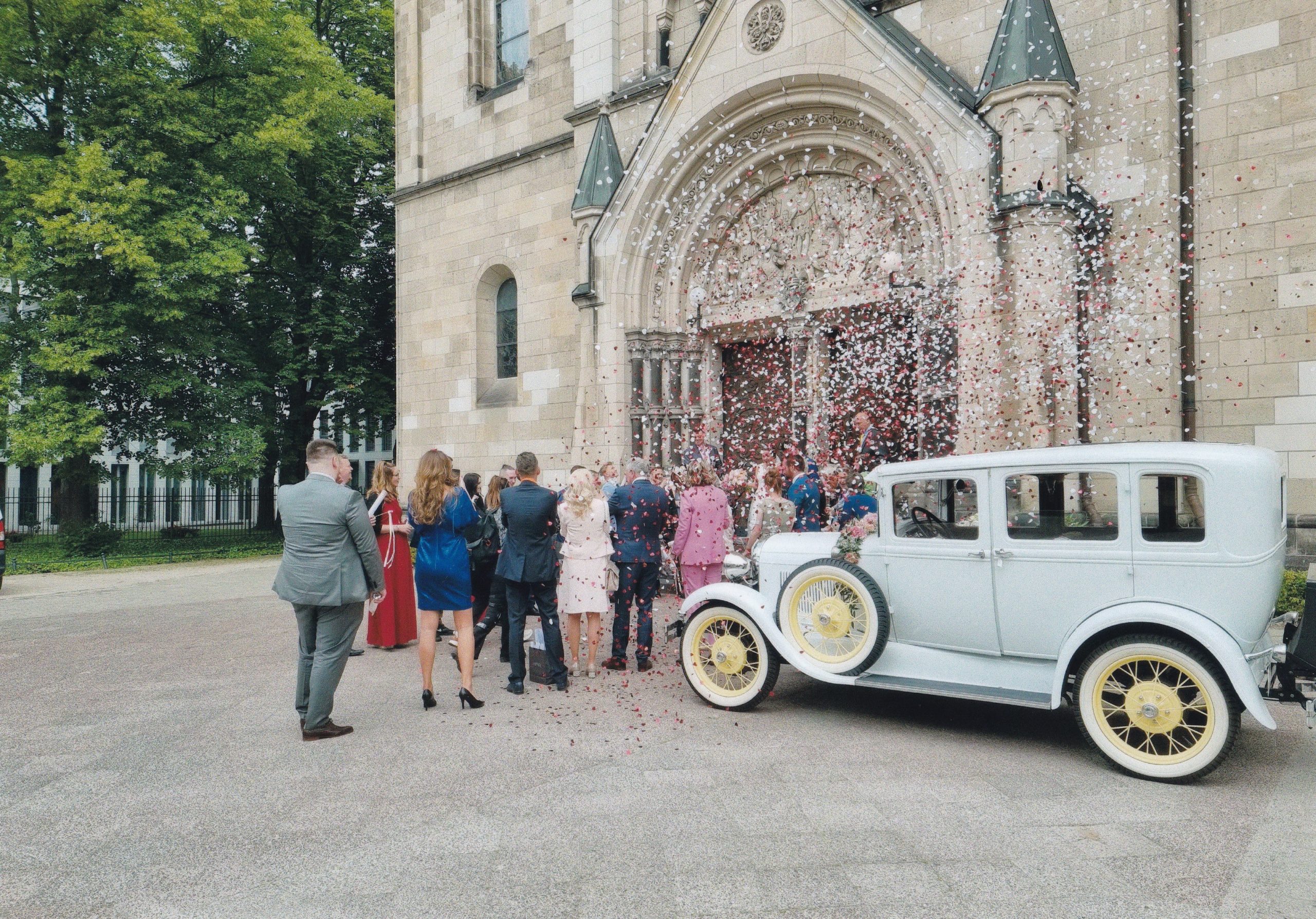 Vor der St. Johannes-Basilika in Berlin Neukölln stand die Brautlimousine heute im dauerhaften Blütenregen.